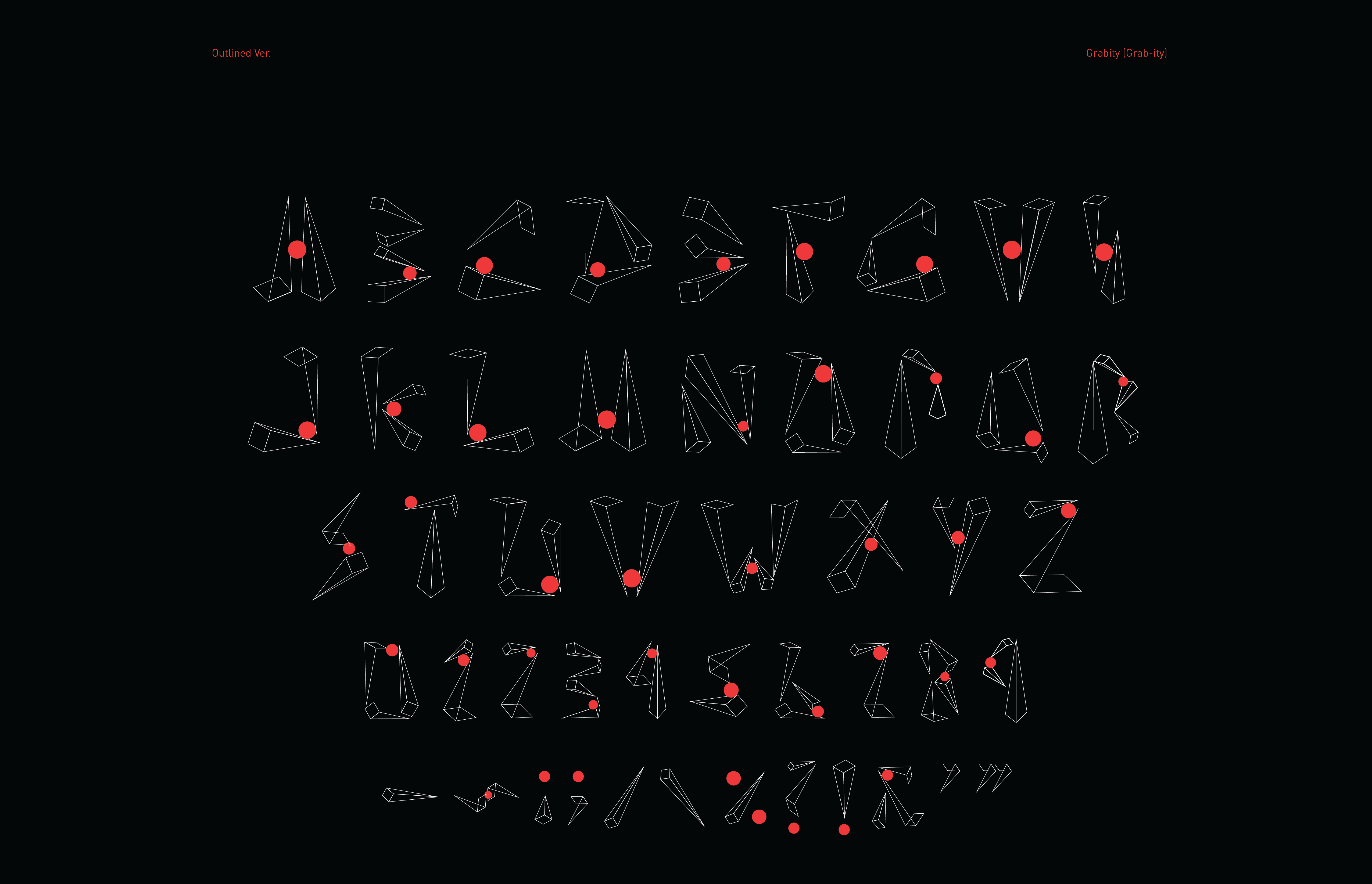 Type Design, Editorial, 2021Grab-ity is a typeface started from a sketch of grabbing food with chopsticks, which looked like the letter ‘H’. I named it ‘Grabity’ as gravity forces things to drop to the ground. The red circles have a strong flow in each letter.