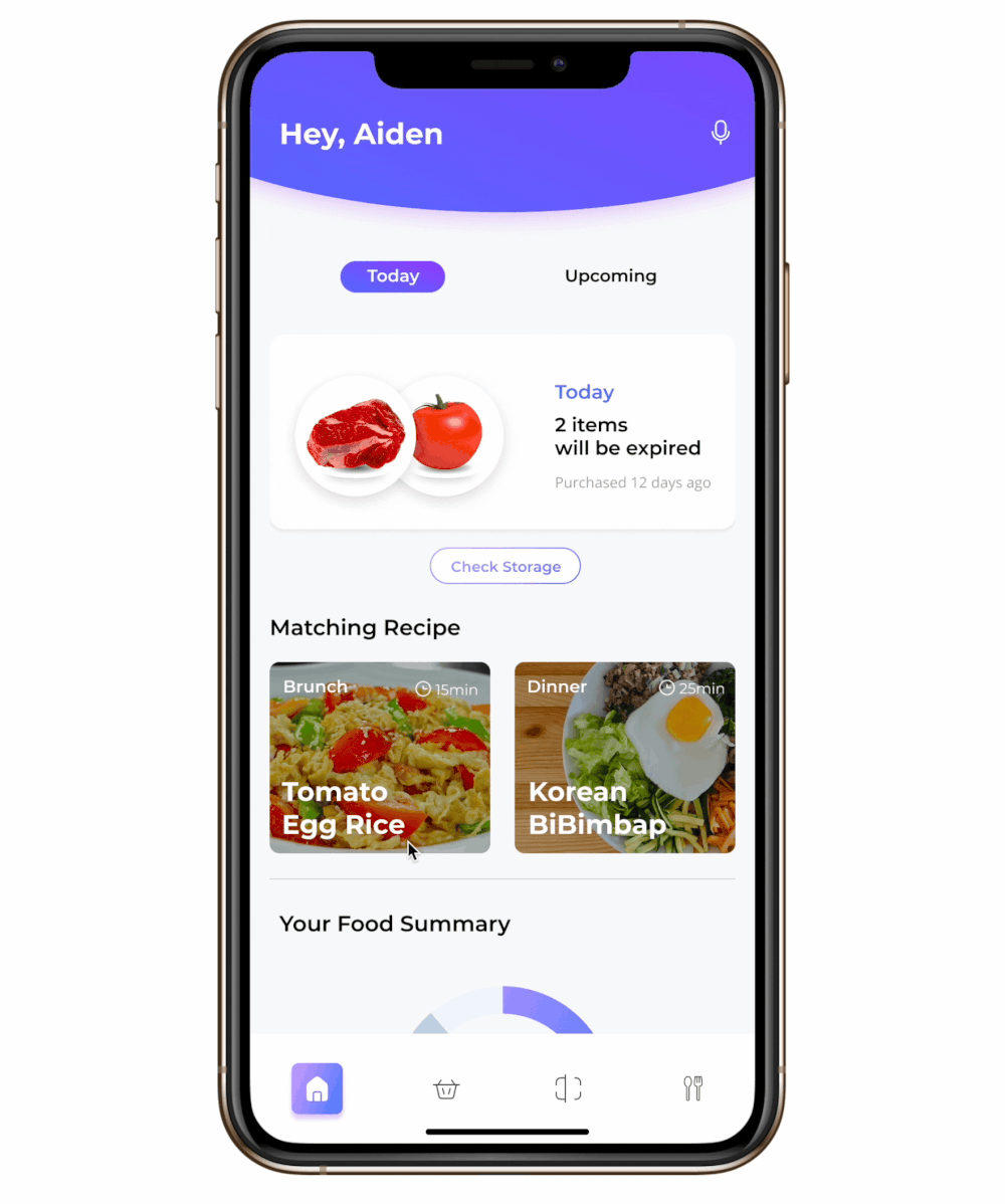 Users can access from Home tab to see upcoming expiring items and choose recommended matching recipes directly. Users can also go to the Cook tab to explore more recipes based on the user’s preferences.